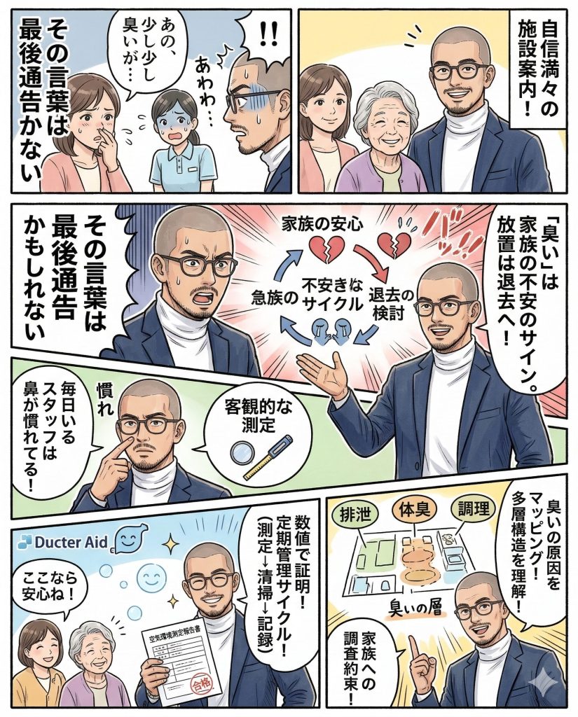 見学に来た家族は、玄関を入った瞬間に無意識に「鼻で判断する」。その瞬間の印象が、入居決定に大きく影響する。どれほど設備が充実していても、スタッフが笑顔であっても、「臭いが気になった」という印象は消えない。